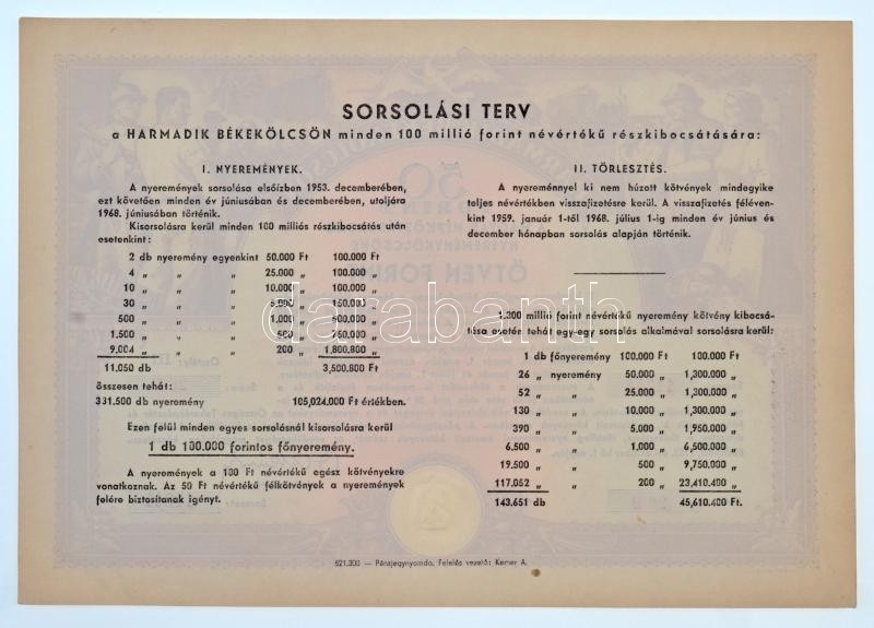Budapest 1952. "Harmadik Békekölcsön" nyereménykölcsön 50Ft-... https://www.darabanth.com/de/30-Gross-Auktion/30.1/Numismatik/Aktien-Tickets-Notgeld-aus-Papier-und-Metal~12150/Budapest-1952-Harmadik-Bekekolcson-nyeremenykolcson-50Ft-rol-szarazpecsettel-TI-Hun~II1861821