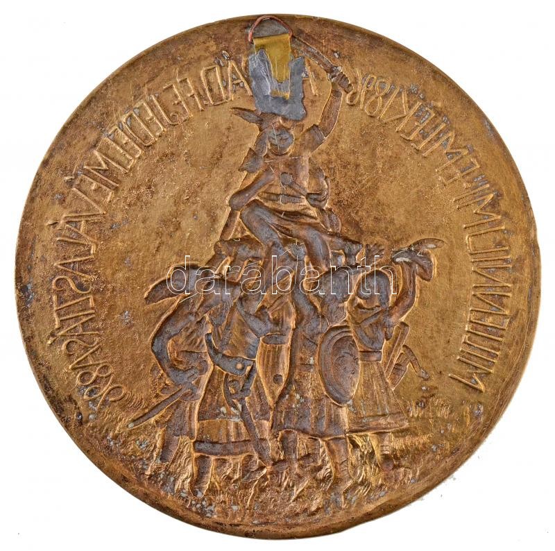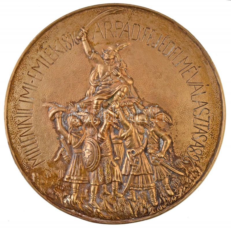 1896. "Milleniumi emlék / Árpád fejedelmé választása" aranyozott réz emlékplakett, hátoldalán akasztóval (609g/207mm) T:2 oxidáció, ph. / Hungary 1896. "Millenium memory / Election of Árpád" gold plated copper commemorative plaque with wall hanger on back (609g/207mm) C:XF oxidation, edge error