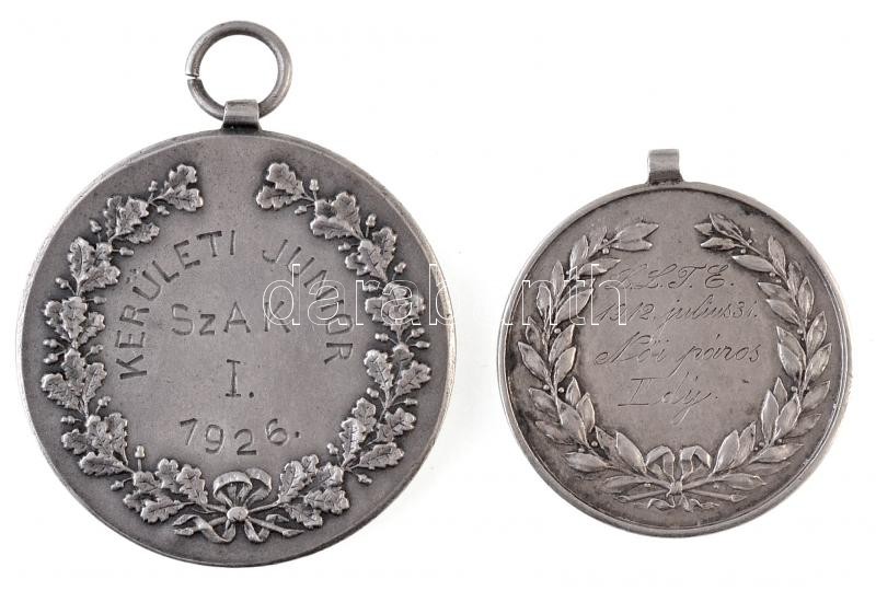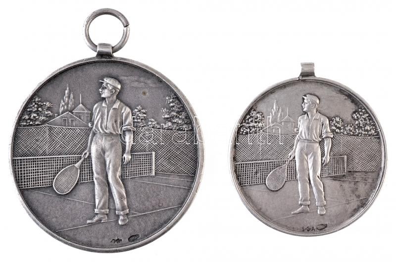 1912. Tenisz díjérem, jelzett Ag, hátoldalon gravírozva "L.L.T.E. 1912. JÚLIUS 31. NŐI PÁROS II. DÍJ", "SGA" gyártói jelzéssel (12,40g/0.800/29,5mm) + 1926. Tenisz díjérem, jelzett Ag, hátoldalon gravírozva "KERÜLETI JUNIOR SZAK I. 1926" (20,05g/0.800/36mm) T:2 / Hungary 1912. Tennis award medal, hallmarked Ag, engraving on back with "SGA" makers mark (12,40g/0.800/29,5mm) + 1926. Tennis award medal, hallmarked Ag with engraving on back (20,05g/0.800/36mm) C:XF