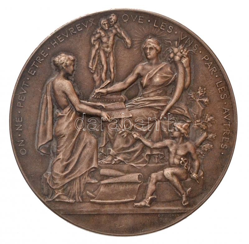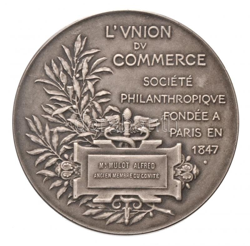 Franciaország ~1900-1910. "On ne pevt etre hevrevx qve les vns par les avtres / L'Vnion dv Commerce - Société Philanthropiqve fondée a Paris en 1847 (Csak egymásért lehetünk boldogok / Szakszervezet(?) - Filantróp Társaság, alapítva Párizsban 1847-ben)" Mr. Mulot Alfred számára, peremén jelzett Ag emlékérem. Szign.: E. Mouchon (65,48g/50mm) T:1-,2 apró ph. / France ~1900-1910. "On ne pevt etre hevrevx qve les vns par les avtres / L'Vnion dv Commerce - Société Philanthropiqve fondée a Paris en 1847 (We can only be happy for each other / Trade-union(?) - Philanthropic Society founded in Paris in 1847)" for Mr. Mulot Alfred, Ag commemorative medal, marked on edge. Sign.: E. Mouchon (65,48g/50mm) C:AU,XF tiny edge error