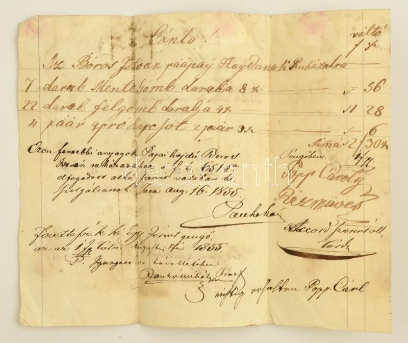 Beschreibung: 1855 Tata, rézműves kézzel számlája, 17x20,5 cm