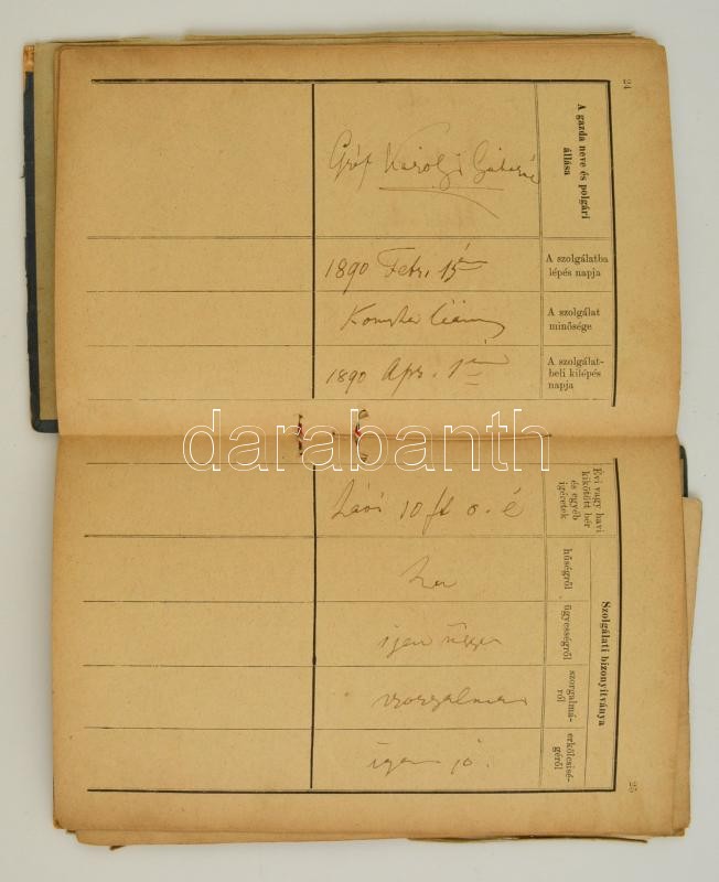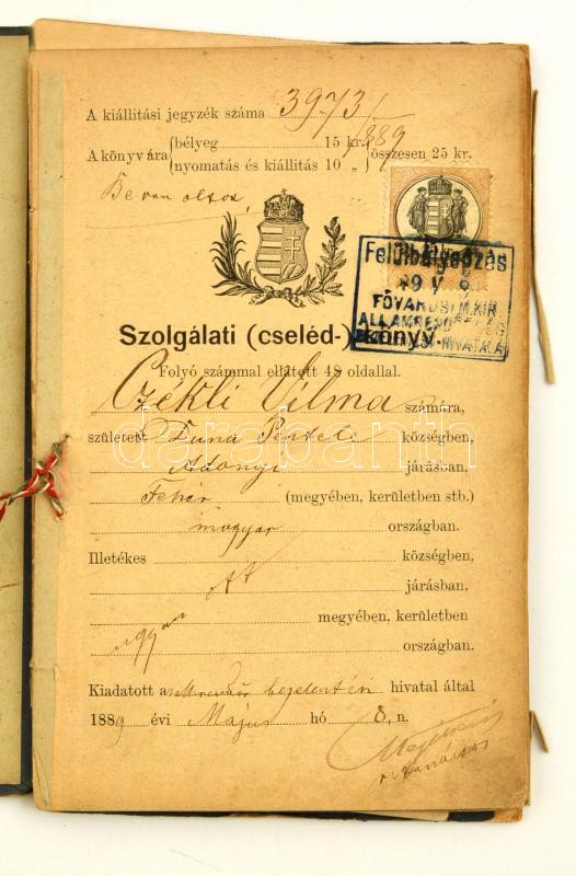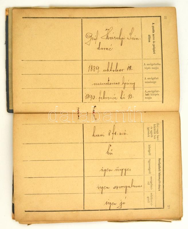 1889 Kitöltött cselédkönyv, okmánybélyeggel, 2 db ajánlólevéllel, Gróf Károlyi Sándorné és Gróf Károlyi Gáborné bejegyzéseivel, első és hátsó borítója elvált