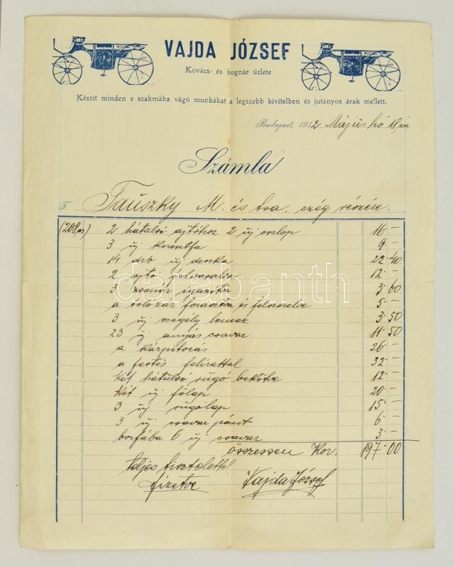 1912 Vajda József kovács és bognár üzlete díszes fejléces számla, 30x... https://www.darabanth.com/de/300-Fernauktion/300.0/Andere-Sammelgebiete/Dokument~16/1912-Vajda-Jozsef-kovacs-es-bognar-uzlete-diszes-fejleces-szamla-30x23-5-cm~II1608199