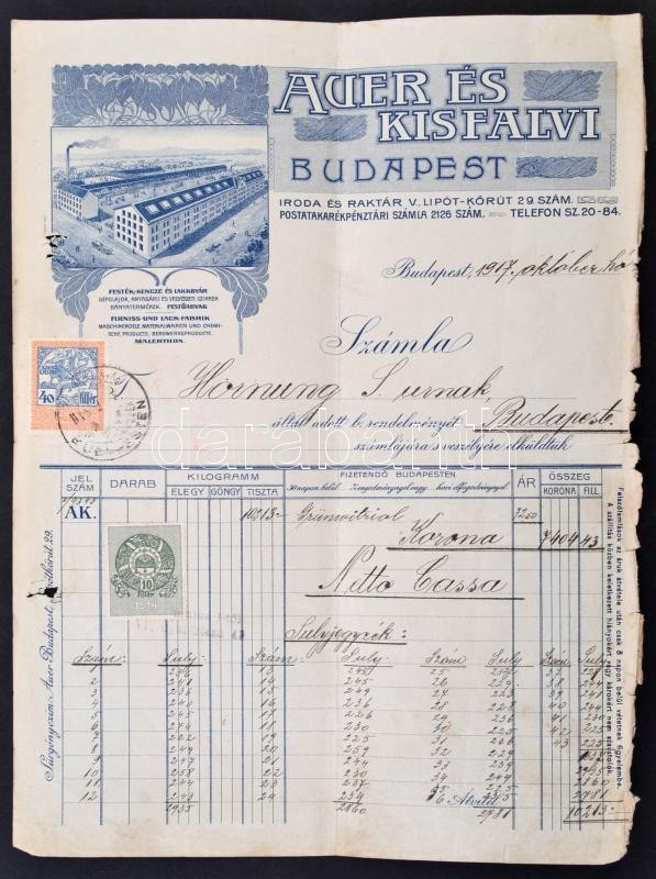 1917 Auger és Kisfalvi festékgyár, díszes fejléces számla, okmánybély... https://www.darabanth.com/de/300-Fernauktion/300.0/Andere-Sammelgebiete/Dokument~16/1917-Auger-es-Kisfalvi-festekgyar--diszes-fejleces-szamla-okmanybelyeggel-viseltes-allap~II1608192