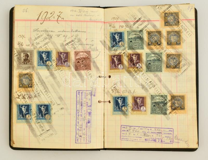 Beschreibung: 1922-1928 Láng István faesztergályos forgalmi adókönyve több száz bélyeggel a 64. p-ig, összesen 128 p.