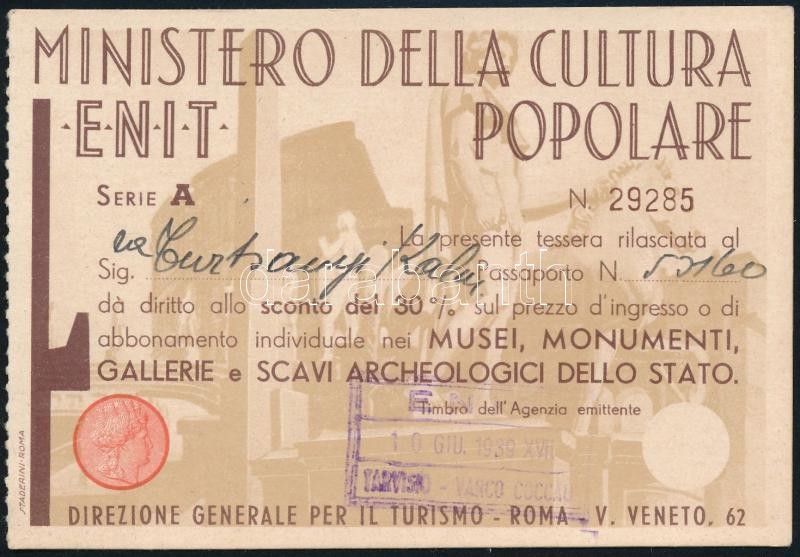 1939 Coccau, Tarvisio, kedvezményes olasz múzeumi belépőjegy Turtsányi... https://www.darabanth.com/de/300-Fernauktion/300.0/Andere-Sammelgebiete/Dokument~16/1939-Coccau-Tarvisio-kedvezmenyes-olasz-muzeumi-belepojegy-Turtsanyi-Kalmanne-Stuhmer-Ell~II1605807