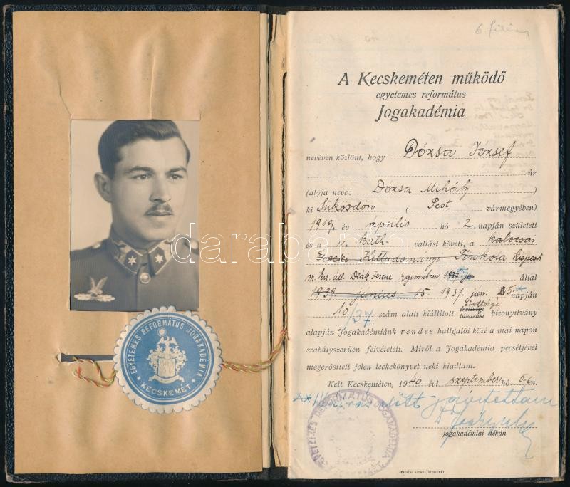 1940 Kecskemét, A Kecskeméten működő egyetemes református jogakadémia által kiállított leckekönyv repülőstiszt számára neves tanárok aláírásával (Joó Gyula, vitéz Révész, stb.)