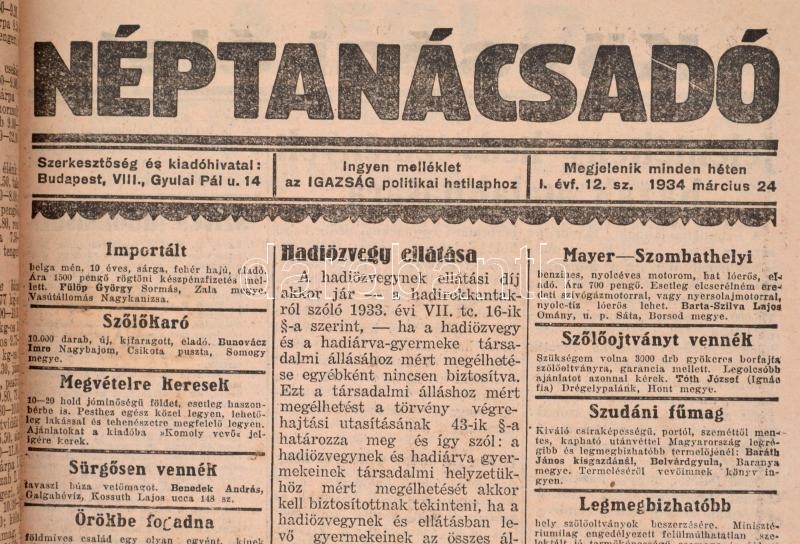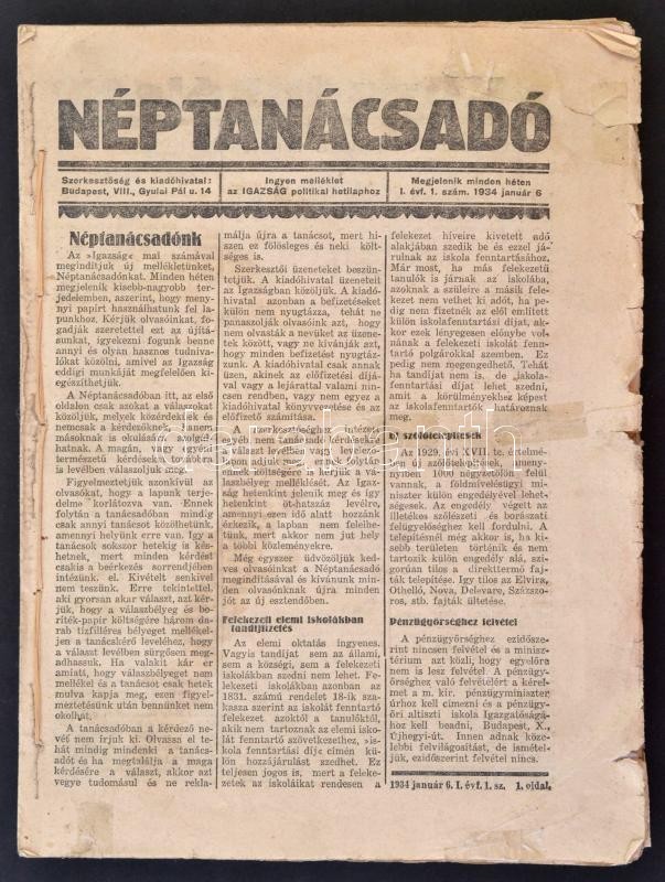 1934 Néptanácsadó. I. évfolyam. 1-49. szám, nem teljes évfolyam. Össze... https://www.darabanth.com/de/300-Fernauktion/300.0/Andere-Sammelgebiete/Drucksachen~27/1934-Neptanacsado-I-evfolyam-1-49-szam-nem-teljes-evfolyam-Osszefuzve-Az-1-szam-els~II1606773