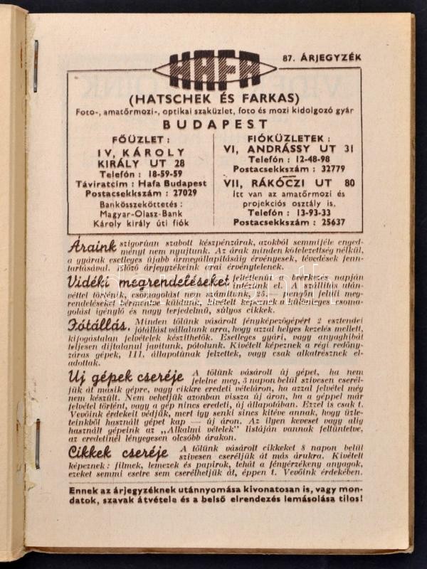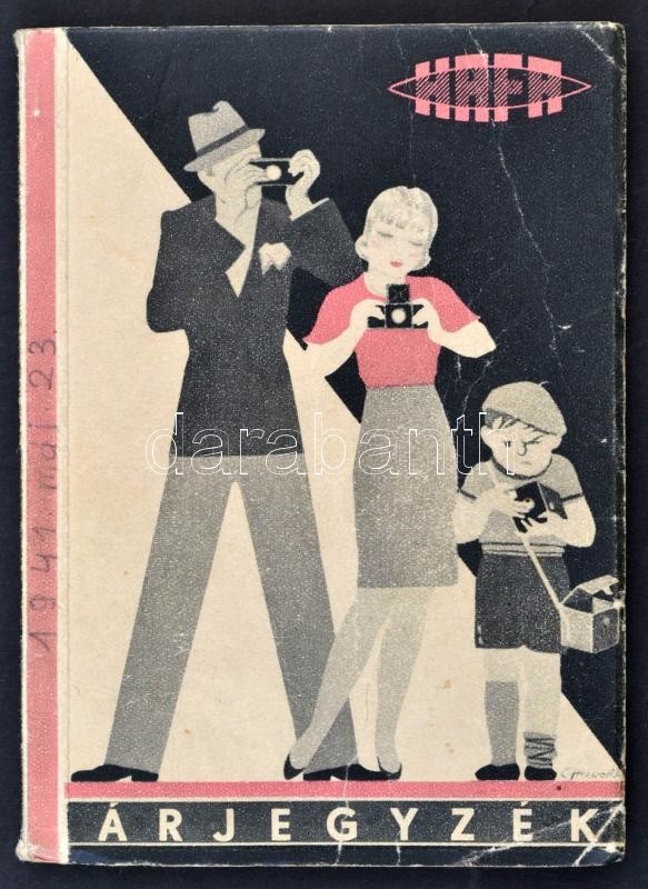 1941 Bp., HAFA fényképező és kamera árjegyzék, képekkel illusztrált https://www.darabanth.com/de/300-Fernauktion/300.0/Andere-Sammelgebiete/Drucksachen~27/1941-Bp-HAFA-fenykepezo-es-kamera-arjegyzek-kepekkel-illusztralt~II1608286