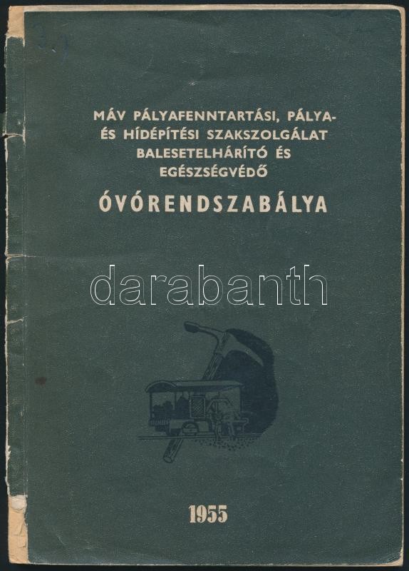 1955 MÁV Pályafenntartási, pálya- és hídépítési szakszolgálat balesetelhárító és egészségvédő óvórendszabálya. Bp., Közlekedési Dokumentációs és Nyomtatványellátó Vállalat. Kissé sérült gerincű papírkötés.