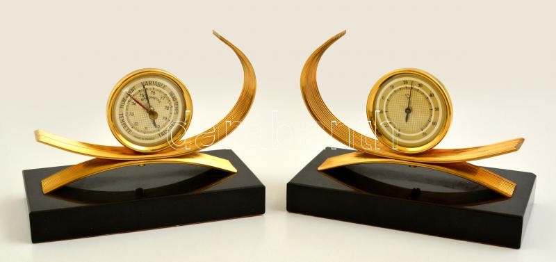 Beschreibung: Gold Starry aranyozott könyvtámasz párban, egyiken hőmérő a másikon barométer mutatóval, jelzett, ónix talapzaton (egyiken lepattanással), m:9,5 cm
