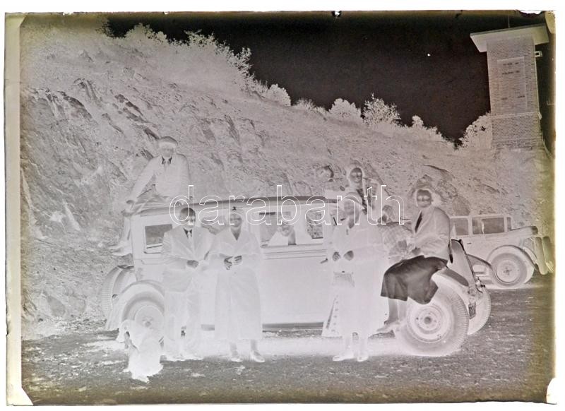 Beschreibung: cca 1920 Kirándulók régi automobillal, üveglemez negatív Matheisel József (1908-1961) rozsnyóbányai fotóművész hagyatékából, 6x9 cm
