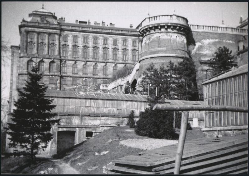 Beschreibung: cca 1950 A budai vár háború utáni helyreállítása, vintage negatívról készült mai nagyítás, 18x25 cm