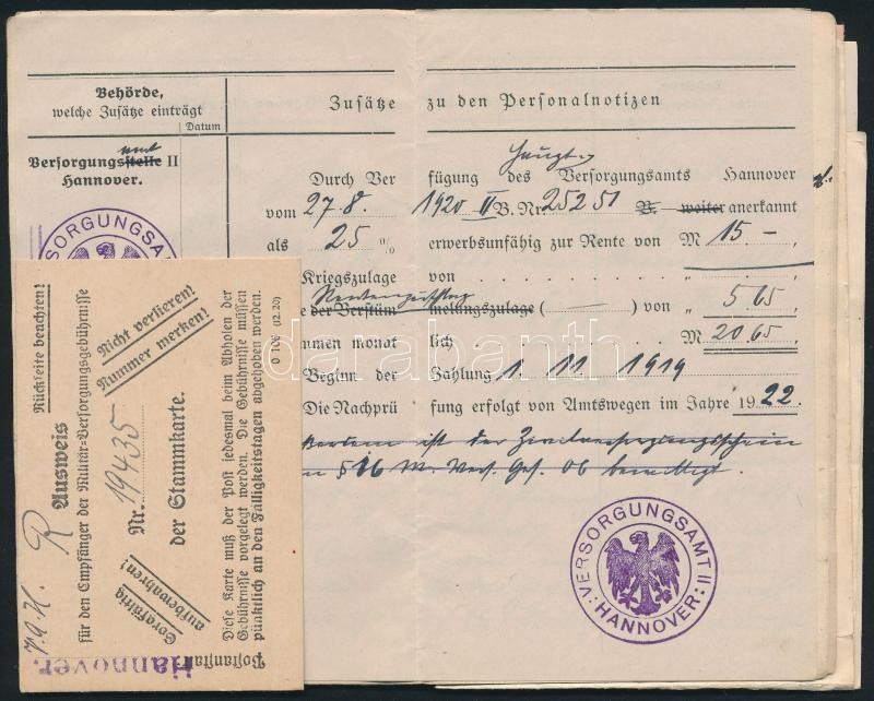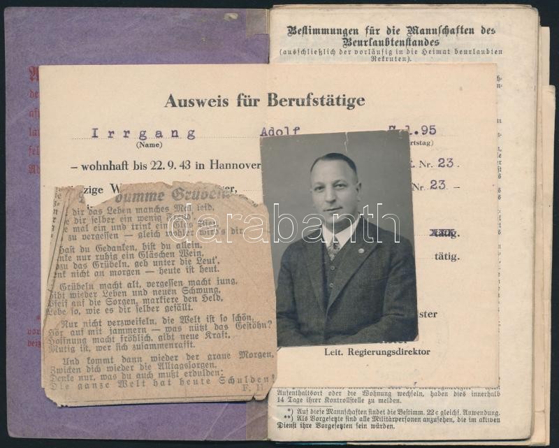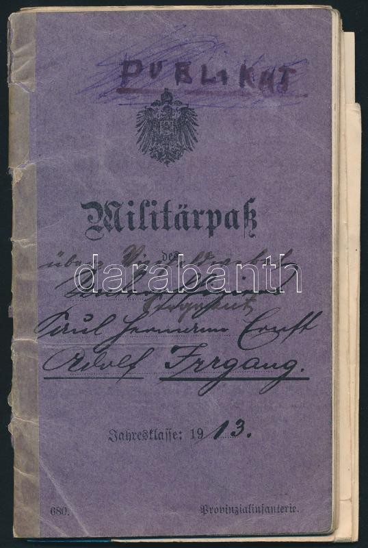 1913-1944 Militäpaß, német katonakönyv, gyalogos katona részére, bejegyzésekkel, pecsétekkel, fotóval, beragasztott, és betűzött papírokkal, igazolványokkal, német, magyar és bolgár nyelven, javított gerincű borítóval. / 1913-1943 Militärpäß, german soldiers book, for infantry soldier, with notices and stamps, with photo, with sticking and quiltied papers, card, in German, Hungarian, ang Bulgarian language, with repaired spine.