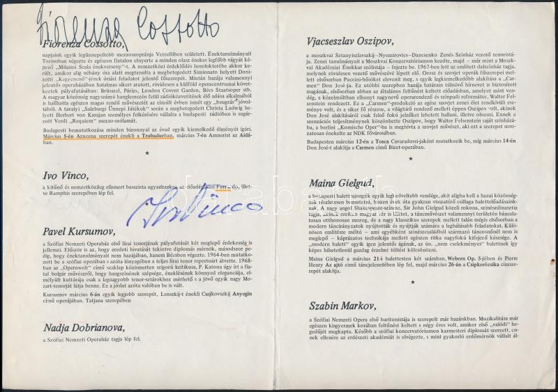 1976 José Carreras (1946-), Ivo Vinco (1927-2014), operaénekesek, Fiorenza Cossotto (1935-) operaénekesnő és Lamberto Gardelli (1915-1998) karmester aláírásai a Magyar Állami Operaház és Erkel Színház prospektusán.
