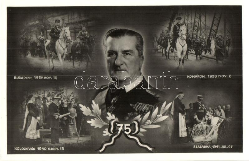 Beschreibung: Horthy Miklós 75. születésnapja emléklap, Magyarország Országgyarapító Kormányzója; Budapest, Komárom, Kolozsvár, Szabadka, bevonulási képekkel.