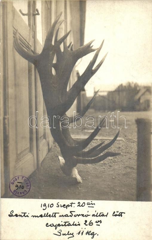 1910 Lenti mellett vadorzó által lőtt capitalis (agancs) / Antler shot... https://www.darabanth.com/de/300-Fernauktion/300.0/Ansichtskarten/Jagd~300097/1910-Lenti-mellett-vadorzo-altal-lott-capitalis-agancs-Antler-shot-by-Hungarian-poacher-phot~II1610923