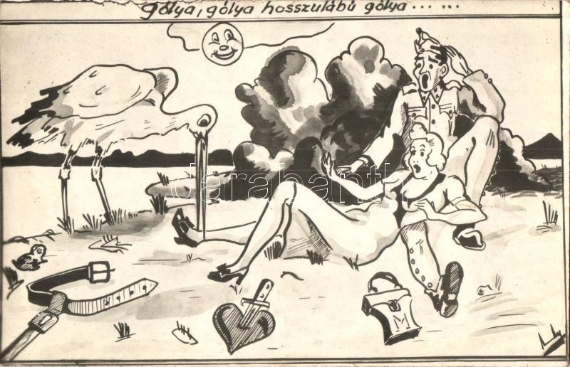 Beschreibung: 1942 Gólya, gólya, hosszúlábú gólya. Második világháborús tábori posta, humoros grafika / WWII Hungarian humorous, erotic graphic military field post