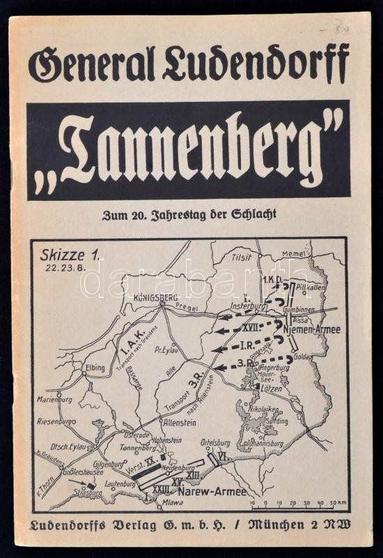 [Erich] Ludendorff: "Tannenberg." Zum 20. Jahrestag der Schlacht. München, é.n.,Ludendorff Verlag, 45+2 p. Kiadói tűzött papírkötés, térképekkel illusztrált, német nyelven./ Paperbinding, with maps, in German language.