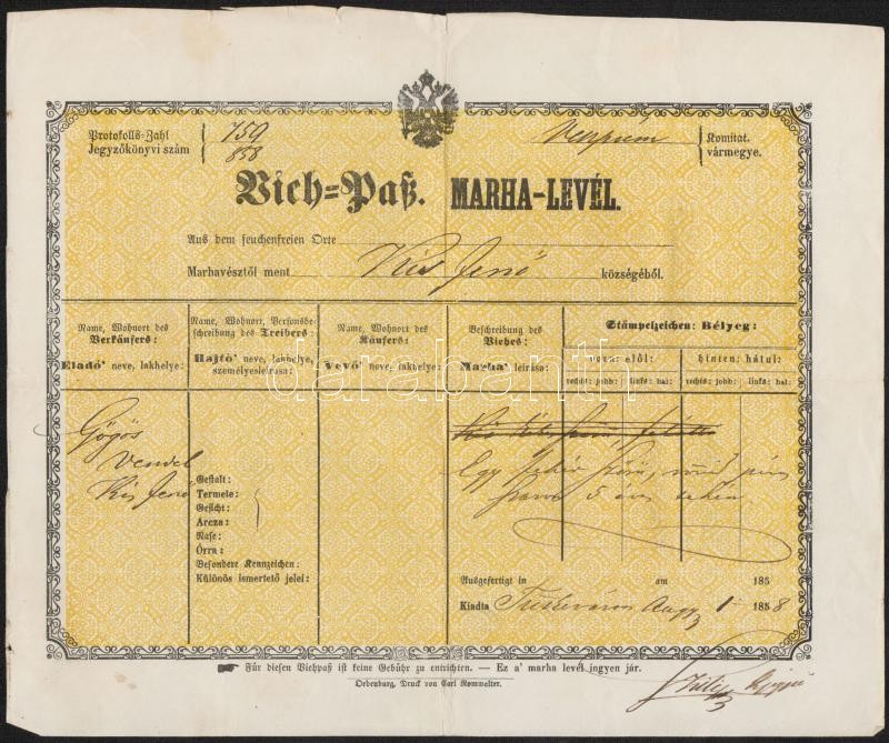 1858 Kisjenő magyar és német nyelvű marhalevél https://www.darabanth.com/de/301-Fernauktion/301.0/Andere-Sammelgebiete/Dokument~17/1858-Kisjeno-magyar-es-nemet-nyelvu-marhalevel~II1619072
