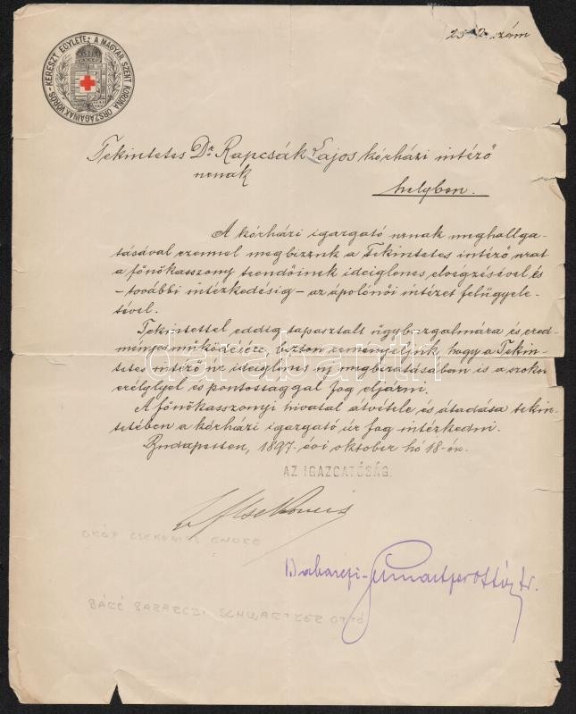 1897 Bp., A Magyar Vöröskereszt Egylet levele kórházi intézőnek az igazgatóság tagjainak (gróf Csekonics Endre és báró Babarczi Schwartzer Ottó) aláírásával