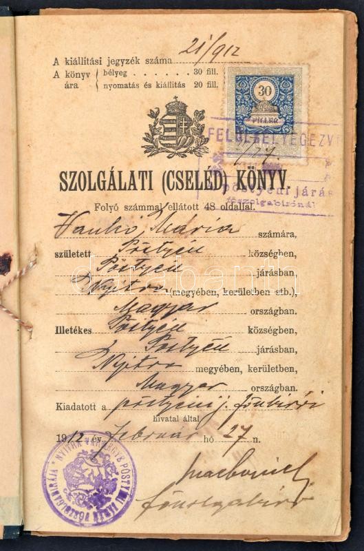Beschreibung: 1912 Pöstyén, Szolgálati cselédkönyv, pecsétel, okmánybélyeggel, bejegyzésekkel