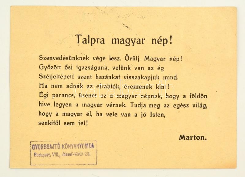 cca 1926 "Talpra magyar nép!" - levelezőlap irredenta szöveggel https://www.darabanth.com/de/301-Fernauktion/301.0/Andere-Sammelgebiete/Drucksachen~29/cca-1926-Talpra-magyar-nep--levelezolap-irredenta-szoveggel~II1600190