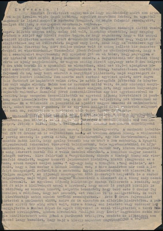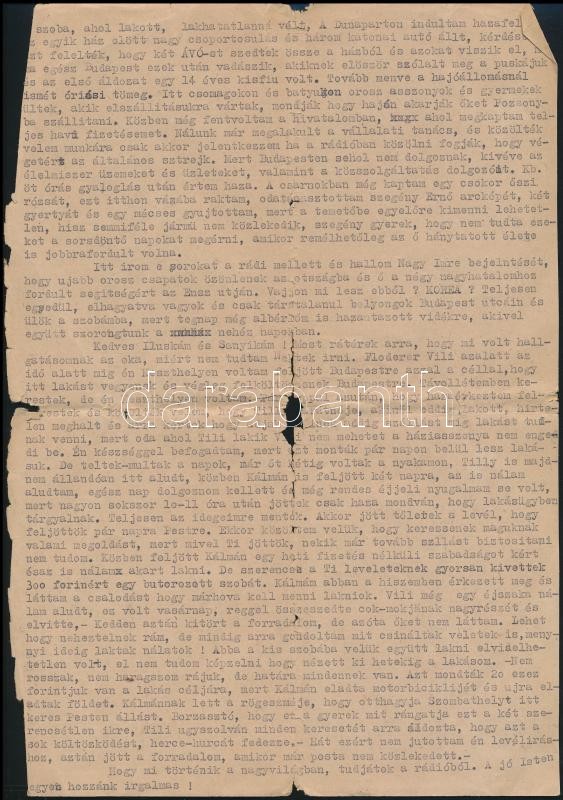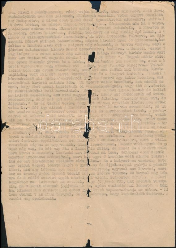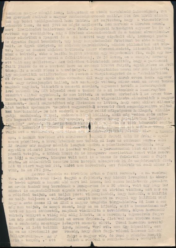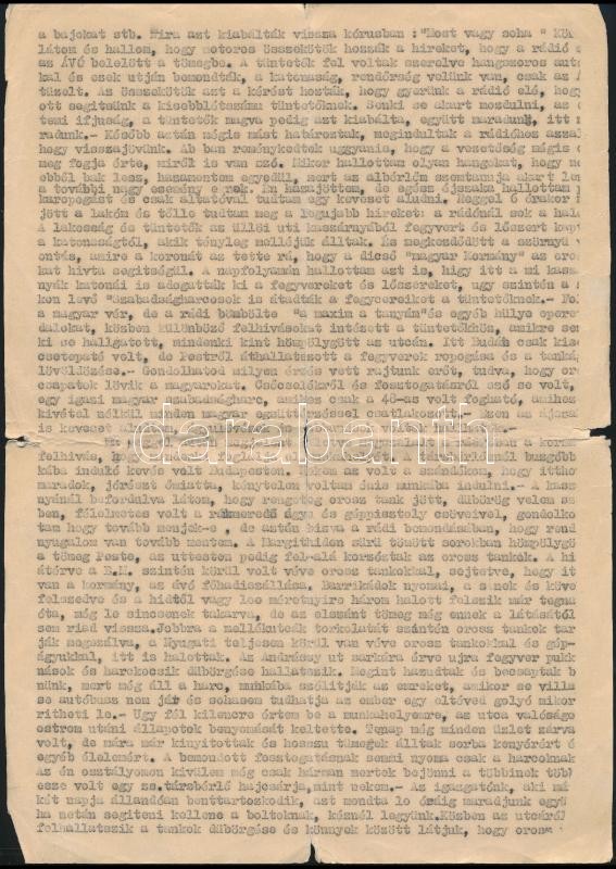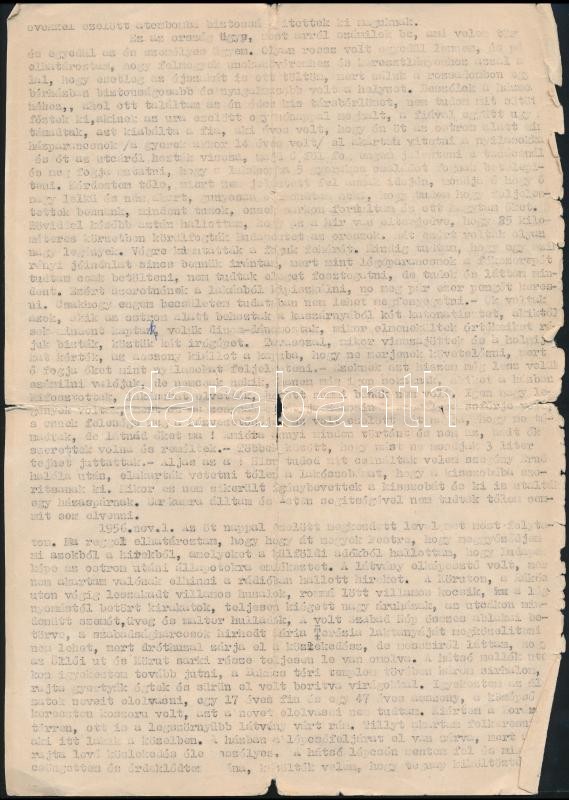 Beschreibung: 1956 Szemtanú feljegyzése az októberi forradalom eseményeiről, 6 gépelt oldal, szélein és a hajtások mentén sérült