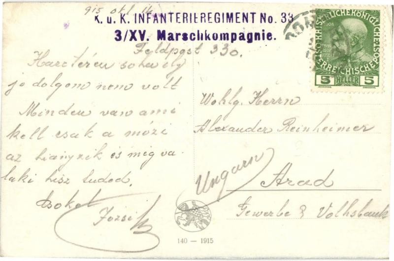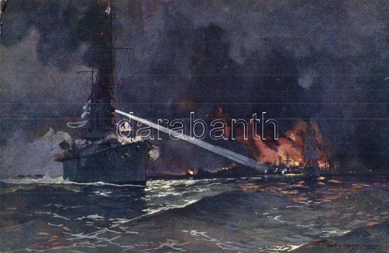 Az Augsburg nevű kis német cirkáló Libaunál megkezdi az ellenségre való tüzelést. Beginn der Seegefechte bei Libau durch den kleinen deutschen Kreuzer 'Augsburg' / K.u.K. navy battle art postcard + K.u.K. Infanterieregiment No. 33. 3/XV. Marschkompagnie s: Harry Heusser