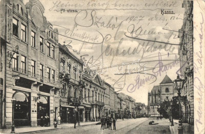 Beschreibung: Kassa, Kosice; Fő utca, Eschwig Ede üzlete. Divald Károyl 810. sz. / main street, shops (EK)