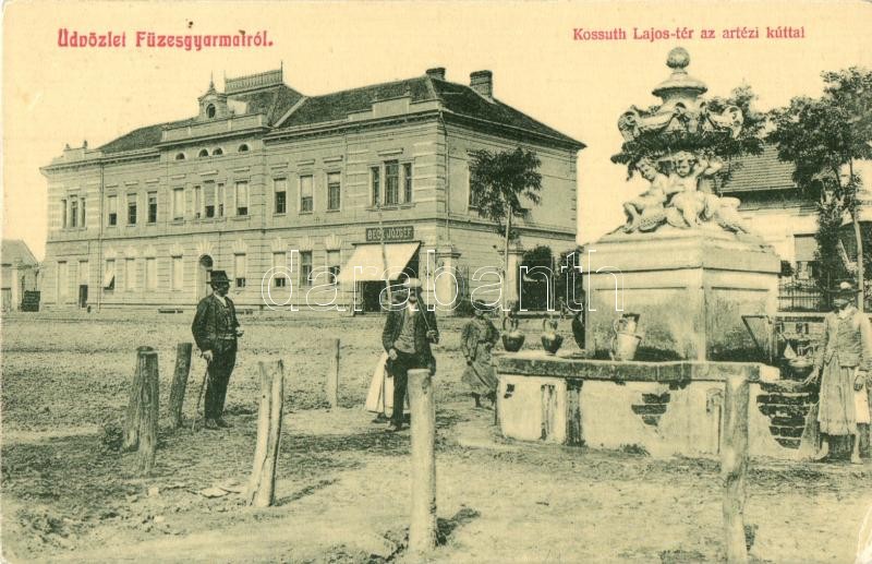 Beschreibung: Füzesgyarmat, Kossuth Lajos tér az artézi kúttal, Községháza, Beck József üzlete. W. L. 1549. Orosz János kiadása (EK)