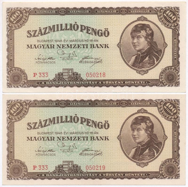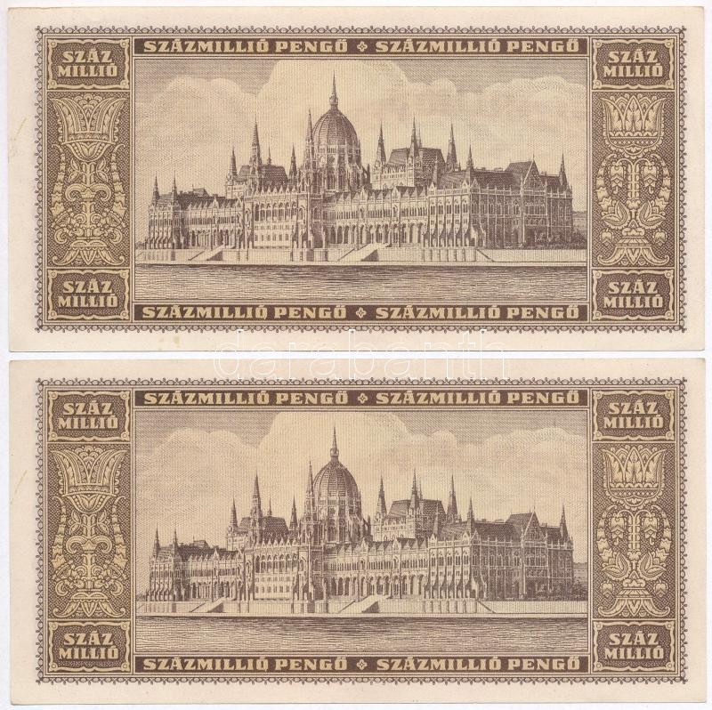 1946. 100.000.000P (2x) sorszámkövetők T:I https://www.darabanth.com/de/301-Fernauktion/301.0/Numismatik/Ungarische-Banknoten~300007/1946-100000000P-2x-sorszamkovetok-TI~II1611370