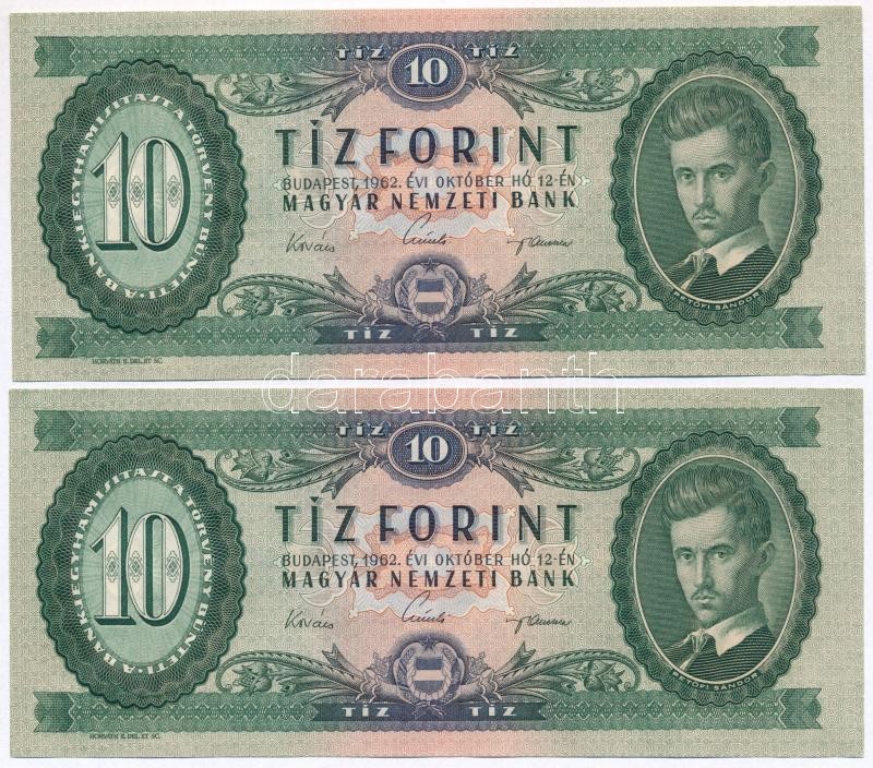 1962. 10Ft (2x) sorszámkövetők T:I https://www.darabanth.com/de/301-Fernauktion/301.0/Numismatik/Ungarische-Banknoten~300007/1962-10Ft-2x-sorszamkovetok-TI~II1613383