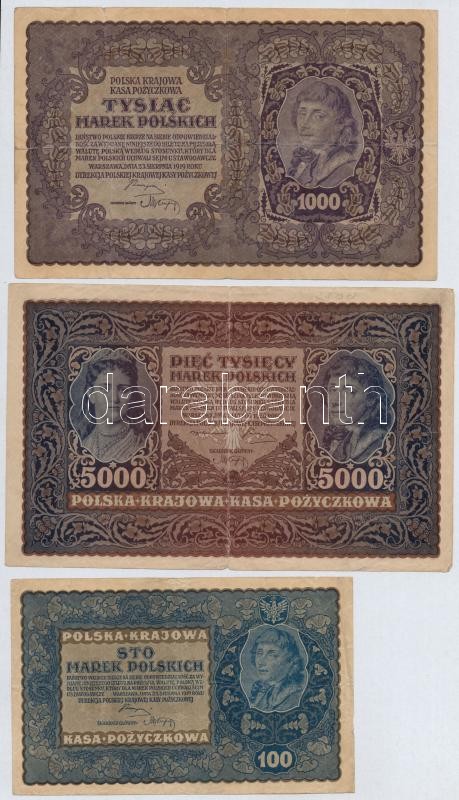 Lengyelország 1919. 100M + 1000M + 1920. 5000M T:III kis szakadás Poland 1919. 100 Marek + 1000 Marek + 1920. 5000 Marek C:F small tear