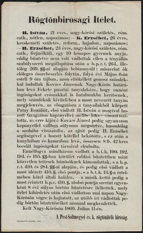 1860 Nagykőrös, rögtönbírósági ítélet rablásért. Halál és 8 évnyi bört... https://www.darabanth.com/de/302-Fernauktion/302.0/Andere-Sammelgebiete/Drucksachen~28/1860-Nagykoros-rogtonbirosagi-itelet-rablasert-Halal-es-8-evnyi-borton-25x40-cm~II1624317