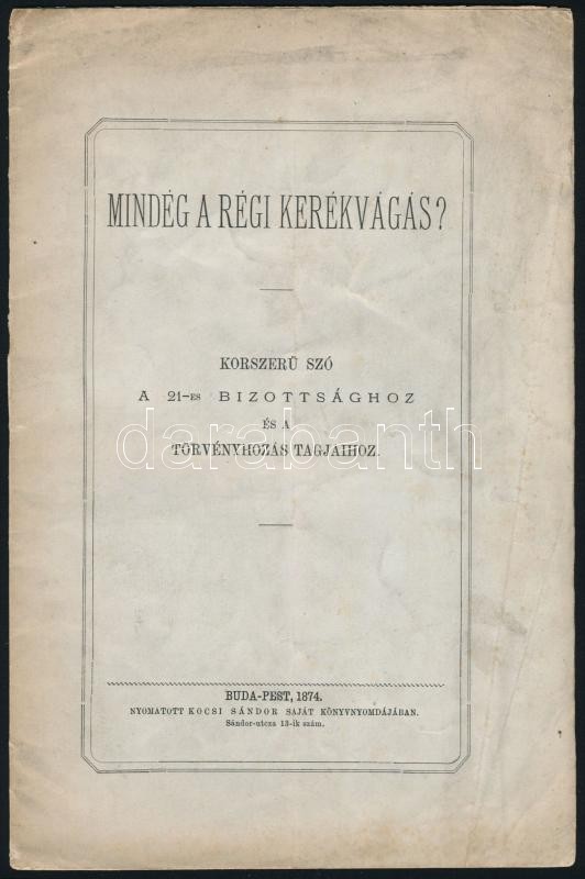1874 Mindég a régi kerékvágás? Korszerű szó a 21-es bizottsághoz és a törvényhozás tagjaihoz. Nyomtatott Kocsi Sándor saját könyvnyomdájában. Felvágatlan lapokkal, 15 p.