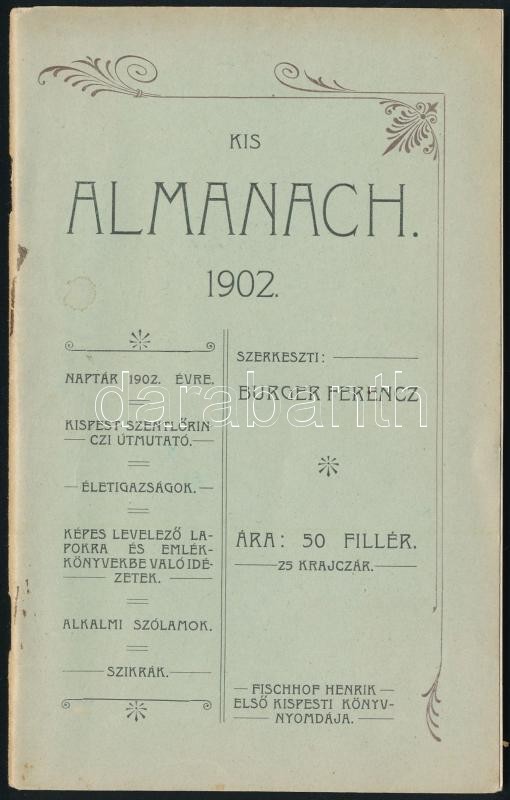 1902 Burger Ferencz (szerk): Kis Almanach. Benne Kispest-Szentlőrinci ... https://www.darabanth.com/de/302-Fernauktion/302.0/Andere-Sammelgebiete/Drucksachen~28/1902-Burger-Ferencz-szerk-Kis-Almanach-Benne-Kispest-Szentlorinci-utmutato-is-40p~II1626483