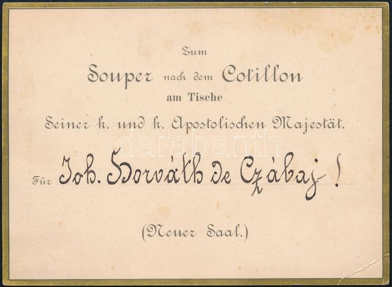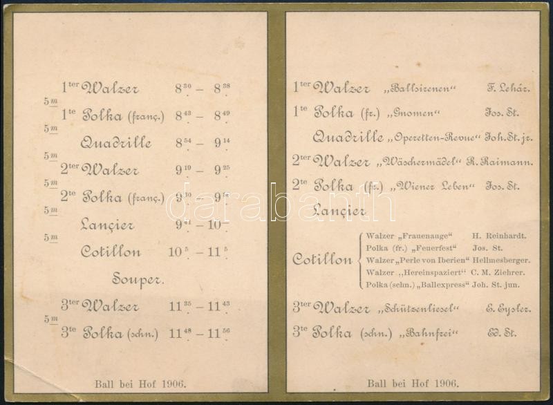 1906 Meghívó Ferenc József császár asztalához udvari bálra, hátoldalán a táncrenddel / Invitation on Royal Ball to the table of the Emperor with dances on the back.