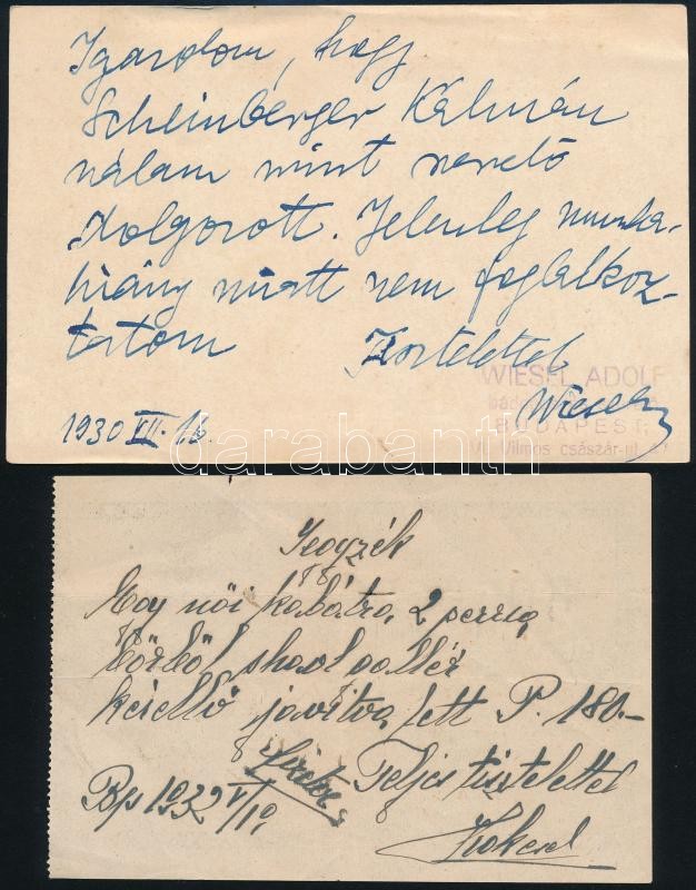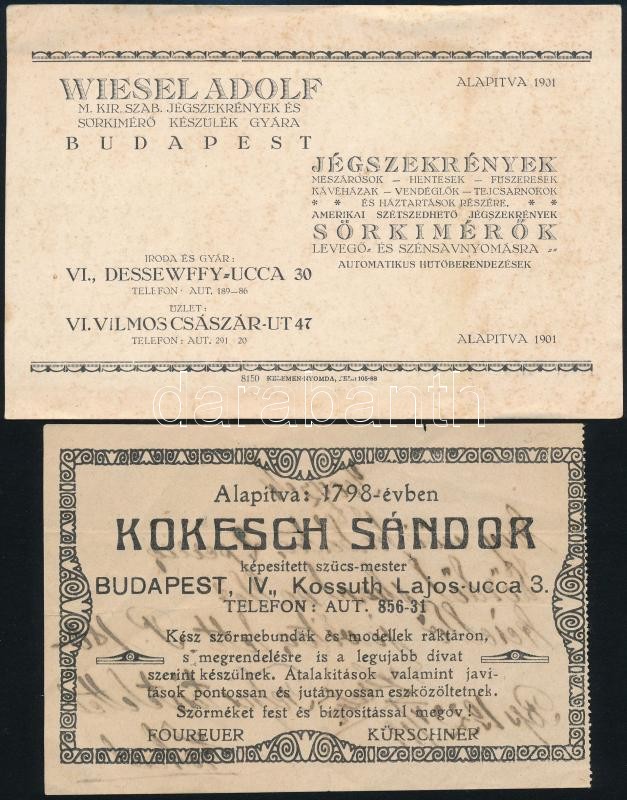 Beschreibung: 1930-1932 Wiesel Adolf jégszekrénygyár és Kokesch Sándor szűcs-mester reklám nyomtatványok, a tulajdonosok aláírásával, 9,5x14 és 10,5x16 cm