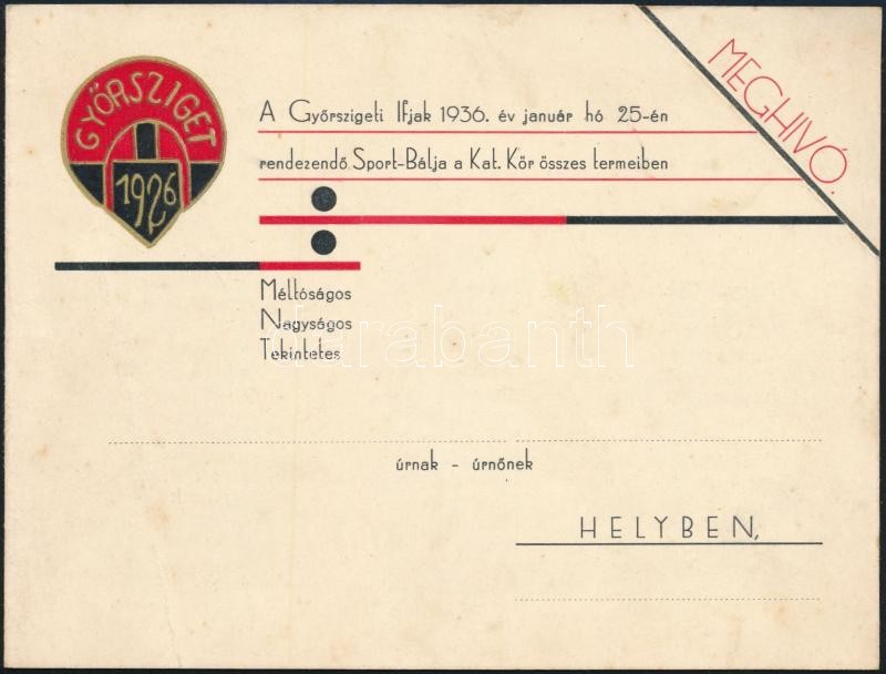 1936 Meghívó a Győrszigeti Ifjak Sport- és Társasköre által rendezett ... https://www.darabanth.com/de/302-Fernauktion/302.0/Andere-Sammelgebiete/Drucksachen~28/1936-Meghivo-a-Gyorszigeti-Ifjak-Sport-es-Tarsaskore-altal-rendezett-sport-balra~II1624374