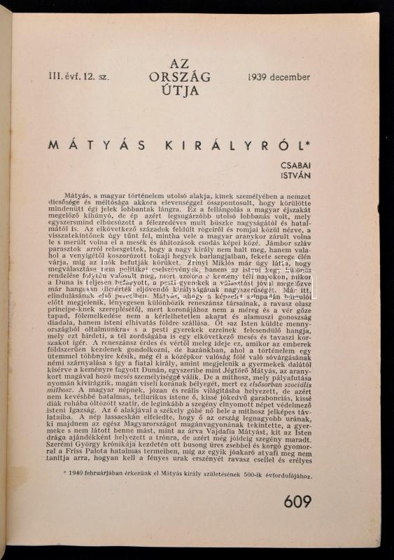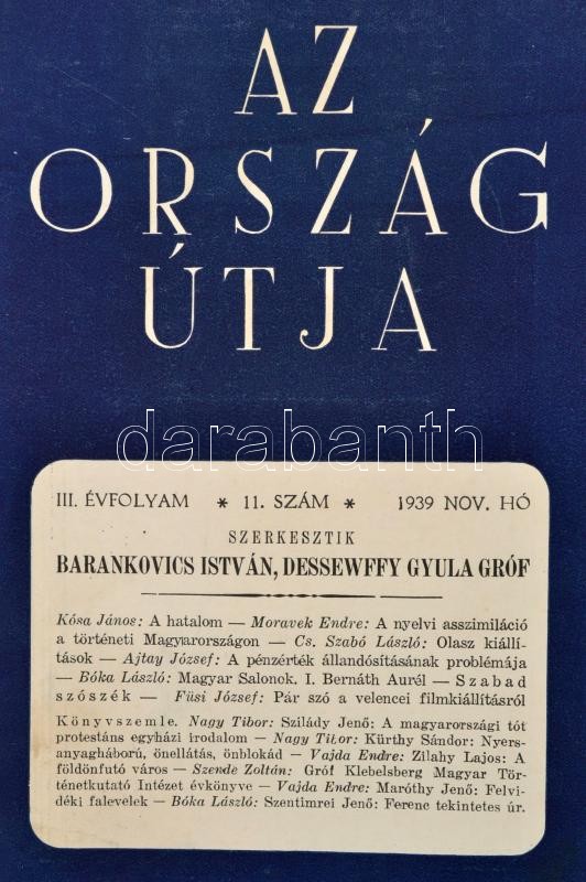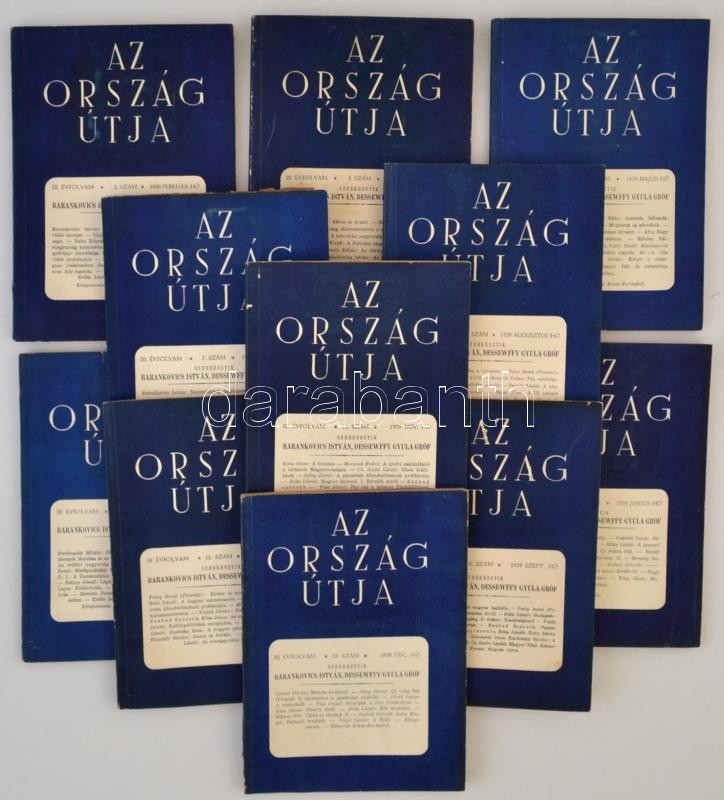 1939 Az ország útja. Állam és nemzetpolitikai folyóirat. Szerk.: Barankovics István, Dessewffy Gyula. 1939. január-december, 1-12. számok. Harmadik, teljes évfolyam. Bp., Deák Ferenc Társaság. Papírkötés, kissé foltos borítókkal, kissé kopottas, kissé sérült gerinccel, Udvardi és Básthi dr. Udvardy Jenő (1880-1941) jogász, kormányfőtanácos, zalaegerszegi ügyvédi kamara elnökének ex libris-szeivel. (7 db.)