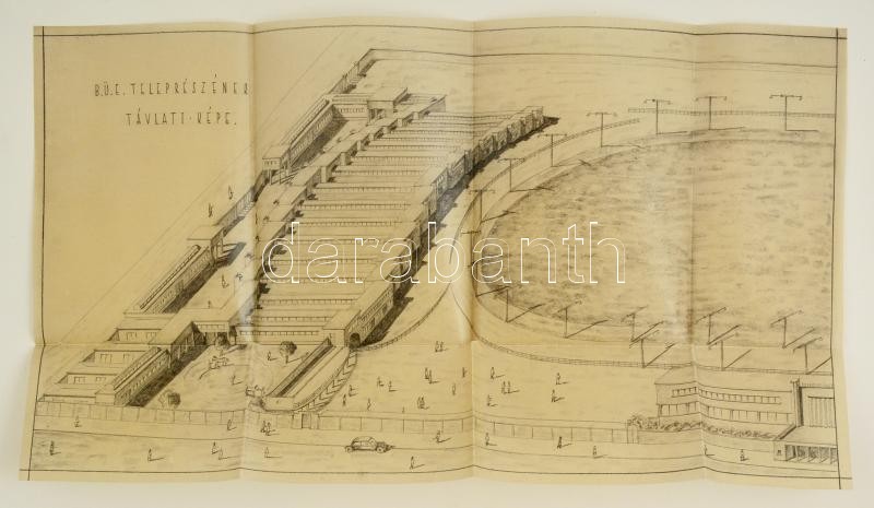 1939 Kerepesi úti ügető (BÜE) teleprészének távlati tervrajza (a tervező: ifj. Paulheim Ferenc). Pauszpapírra készült nyomat, nagyon apró szakadások, hajtogatva, rajzolt méret:75x42 cm