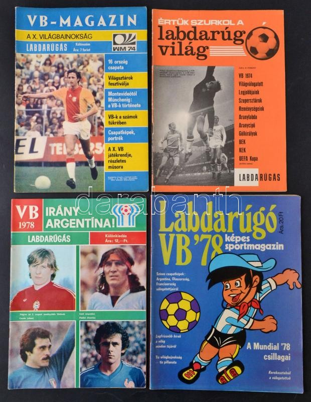 1974-1978 Labdarúgás különszámok, 4 db (A X. Világbajnokság, Értük szurkol a labdarúgó világ VB 1974, VB 1978 Irány Argentina! Labdarúgó VB '78.) 1974-es NSZK-ban, 1978-as Argentinában tartott világbajnokságok különszámai. Papírkötés. Jó állapotban.