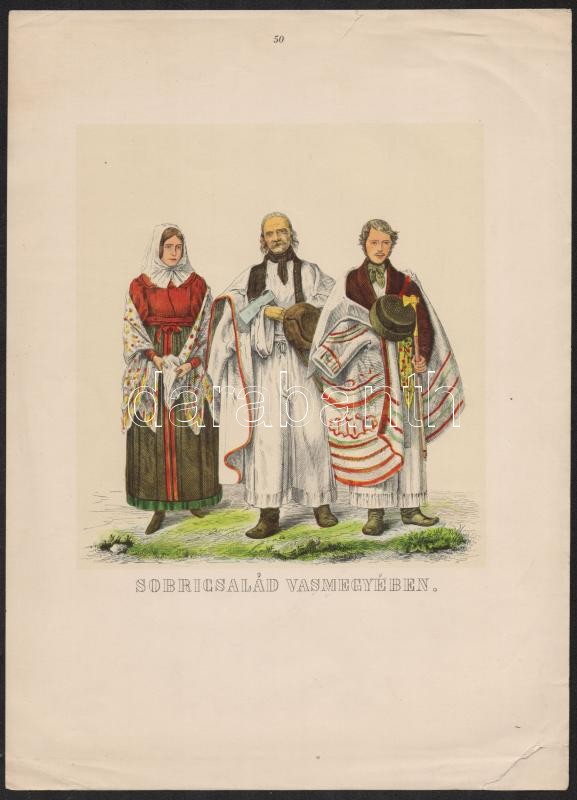 Beschreibung: Sobricsalád Vasmegyében. Kresz Mária: Magyar parasztviselet. Budapest, 1956, Akadémiai Kiadó, 50. tábla. Reprint kiadás, kis szakadásokkal, 33x24 cm.