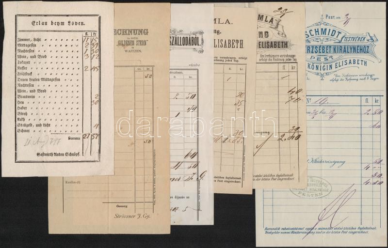 Beschreibung: cca 1870-1900 5 db régi magyar szállodai számla, díszes grafikákkal