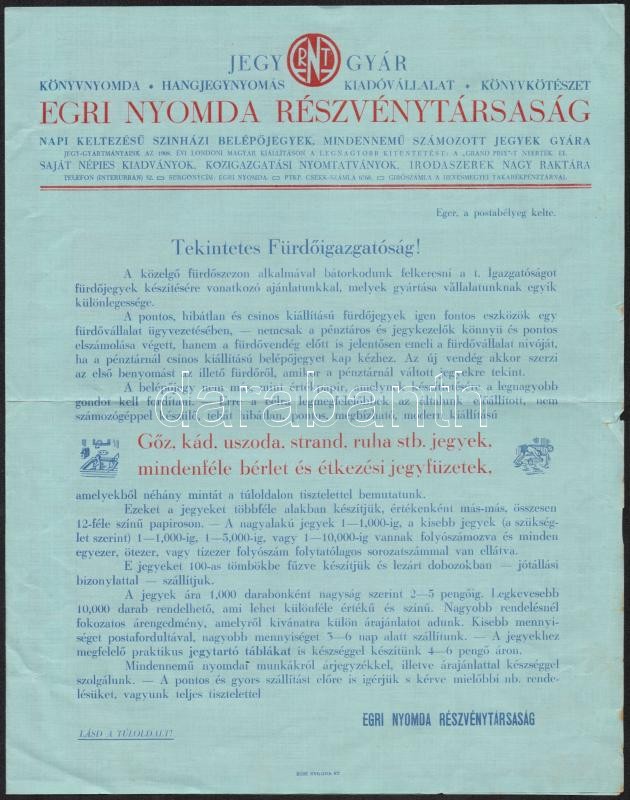 cca 1910 Egri Nyomda Rt. Jegy gyár jegyeket bemutató nyomtatvány. 4p. https://www.darabanth.com/de/302-Fernauktion/302.0/Andere-Sammelgebiete/Drucksachen~28/cca-1910-Egri-Nyomda-Rt-Jegy-gyar-jegyeket-bemutato-nyomtatvany-4p~II1622110