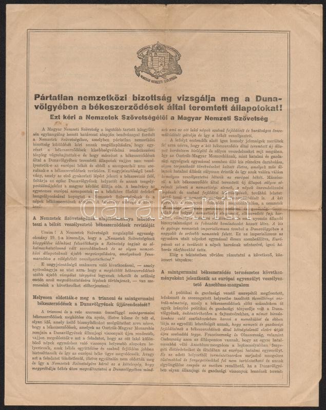 cca 1920 Magyar Nemzeti Szövetség: Pártatlan nemzetközi bizottság vizsgélja meg a Duna-völgyben a békeszerződések által teremtett állapotokat! 4 p. térképekkel.