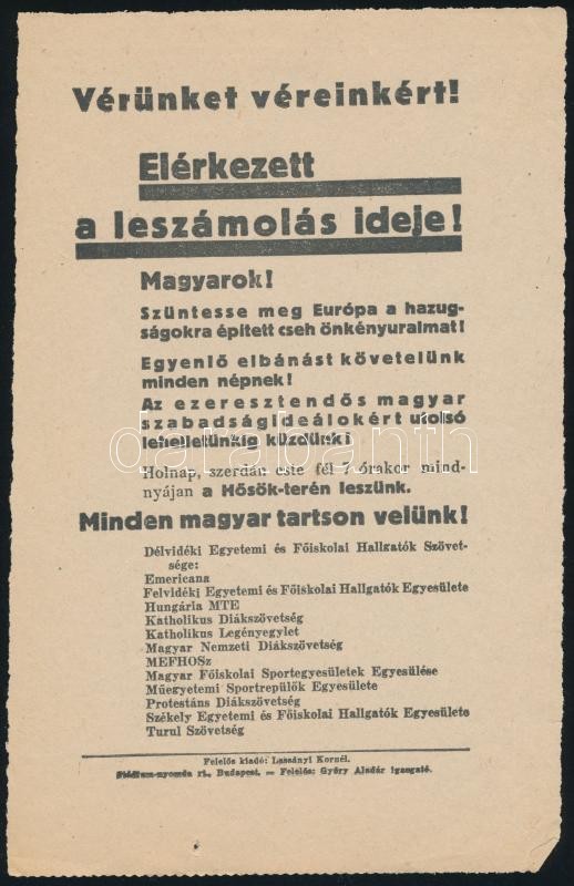 cca 1920 "Vérünket véreinkért! Elérkezett a leszámolás ideje!", irrede... https://www.darabanth.com/de/302-Fernauktion/302.0/Andere-Sammelgebiete/Drucksachen~28/cca-1920-Verunket-vereinkert-Elerkezett-a-leszamolas-ideje-irredenta-roplap~II1570565