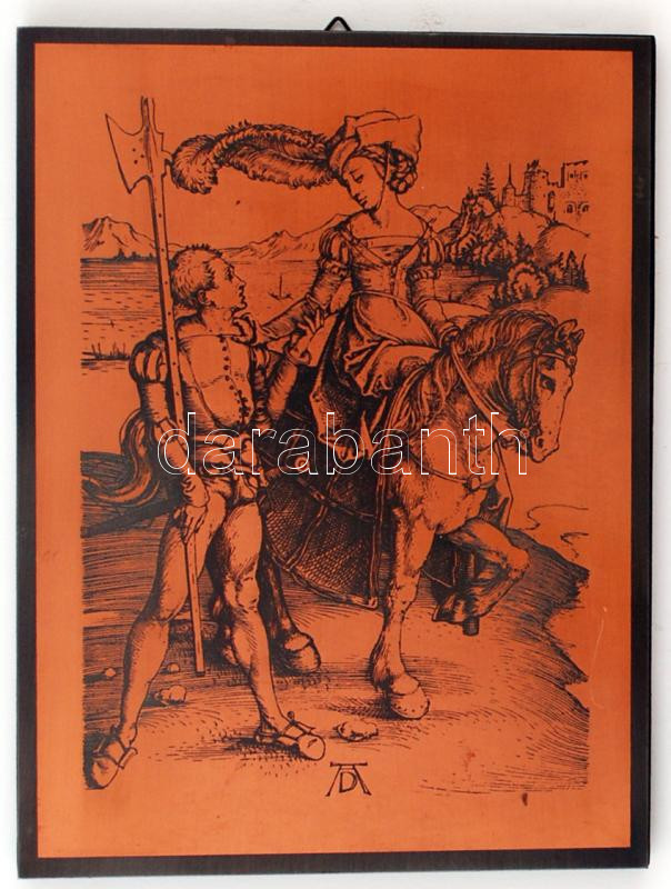 Beschreibung: Albrecht Dürer "Hölgy lóháton Landsknechttel" című rézmetszete után készült dekoratív falikép, 24×18 cm