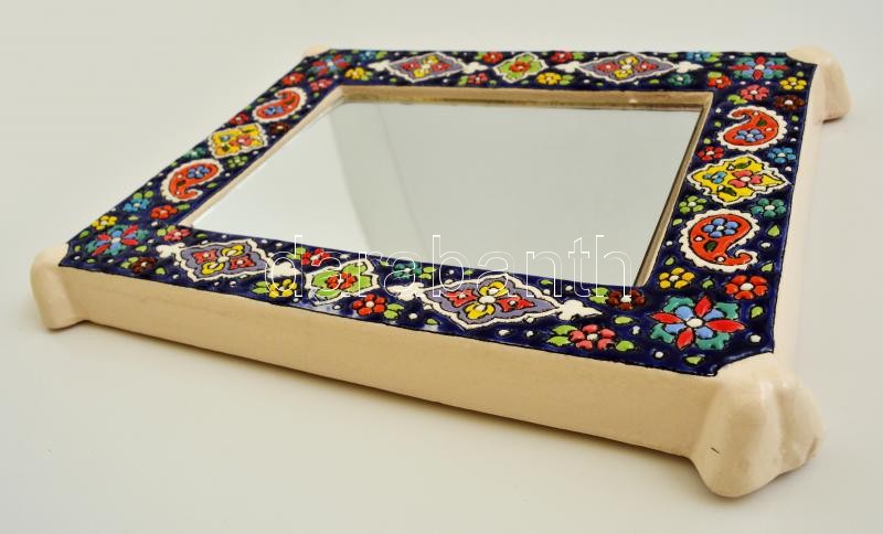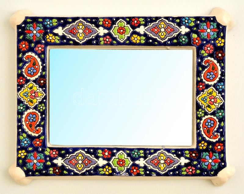 Beschreibung: Díszes virágmintás modern perzsa kerámia keretes modern falitükör, kézzel festett, belső méret: 15,5×10,5 cm, külső méret: 24×19,5 cm